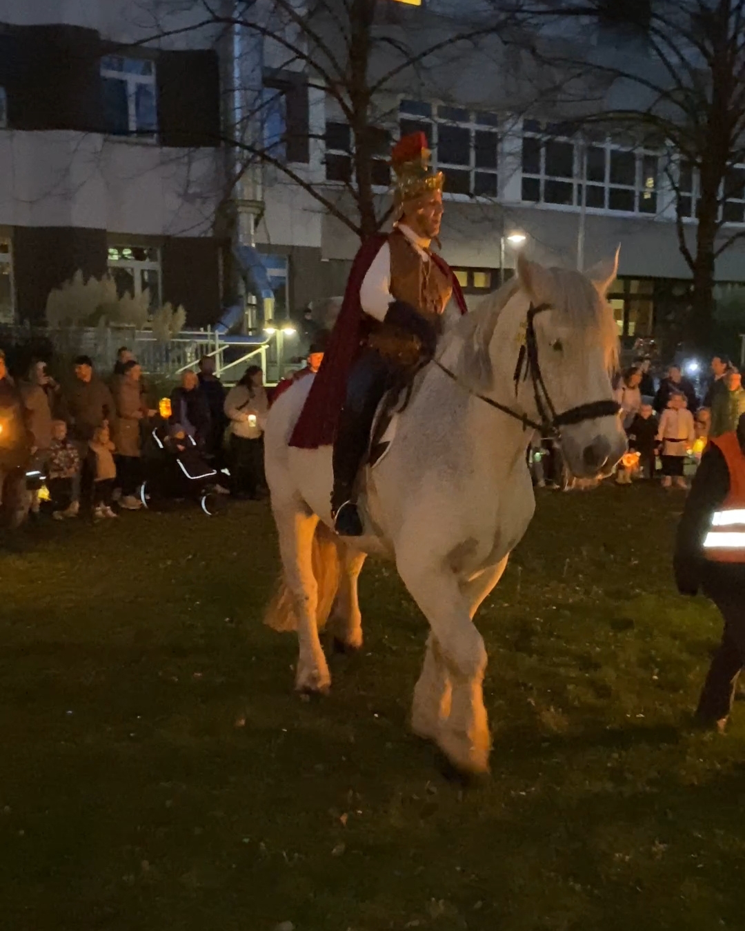 Begleitet von den vielen Kindern des Kindergartens St. Peter, die stolz ihre bunten Laternen trugen, ritt St. Martin am frühen Abend in den hell erleuchteten Innenhof des Krankenhauses ein. Dort wurden er, die Kinder mit ihren Familien sowie zahlreiche Besucherinnen und Besucher herzlich von Alexander Bey, dem leitenden Oberarzt der Kinderklinik, begrüßt und zum fröhlichen Mitsingen der Martinslieder eingeladen.