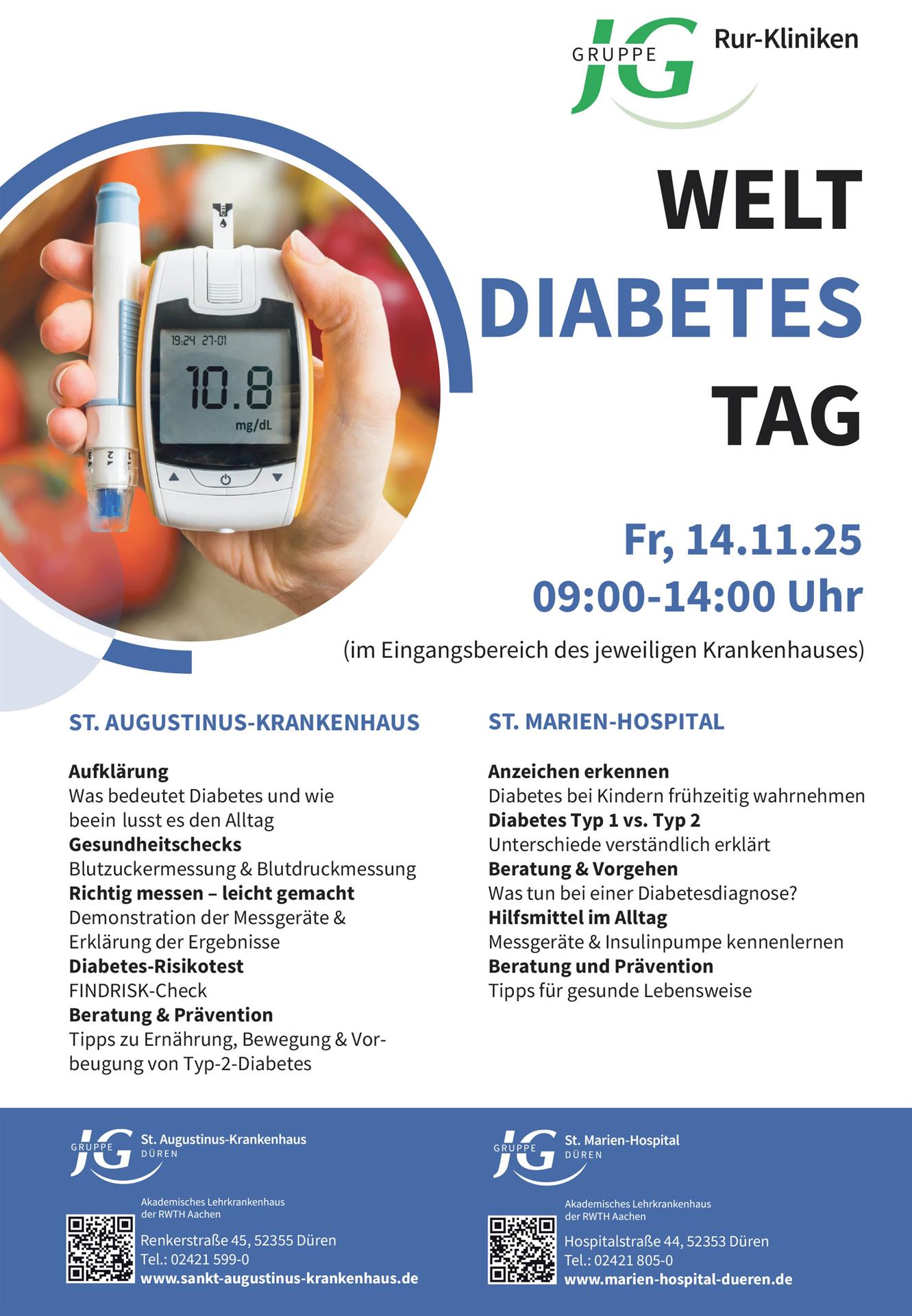 Düren. Anlässlich des Welt-Diabetes-Tages am Freitag, 14. November 2025, laden die Rur-Kliniken – das St. Augustinus-Krankenhaus und das St. Marien-Hospital in Düren – von 09:00 bis 14:00 Uhr zu einer umfassenden Informations- und Beratungsaktion ein. Beide Veranstaltungen finden im Eingangsbereich der jeweiligen Krankenhäuser statt.