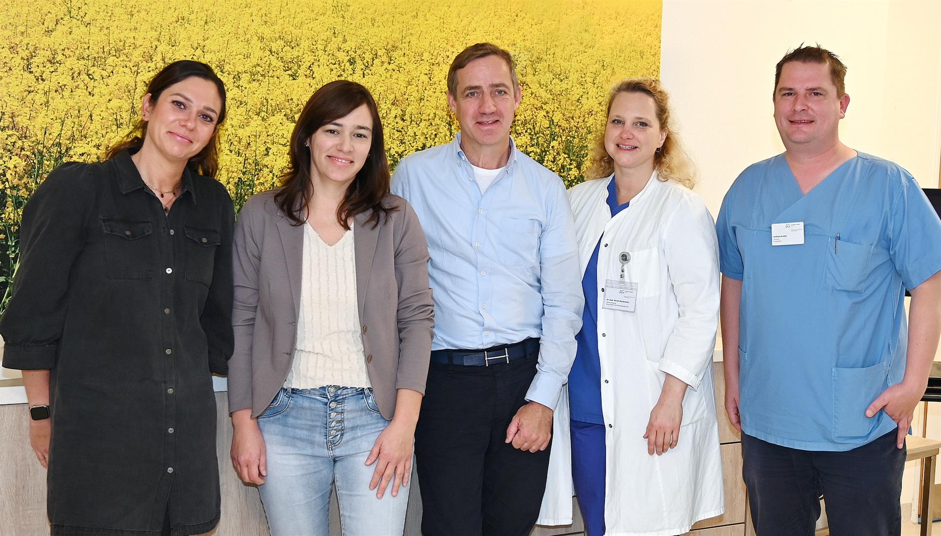 Foto (© T. Opgenorth) v.l.: Hebammen Anja Brauers und Verena Rüttgers, Dr. med. Axel Sauerwald (Chefarzt der Frauenheilkunde und Geburtshilfe), Dr. med. Miriam Barkowsky (Sektionsleitung Geburtshilfe und Pränataldiagnostik) und Andreas Kreder (Kinderarzt und Neonatologe)